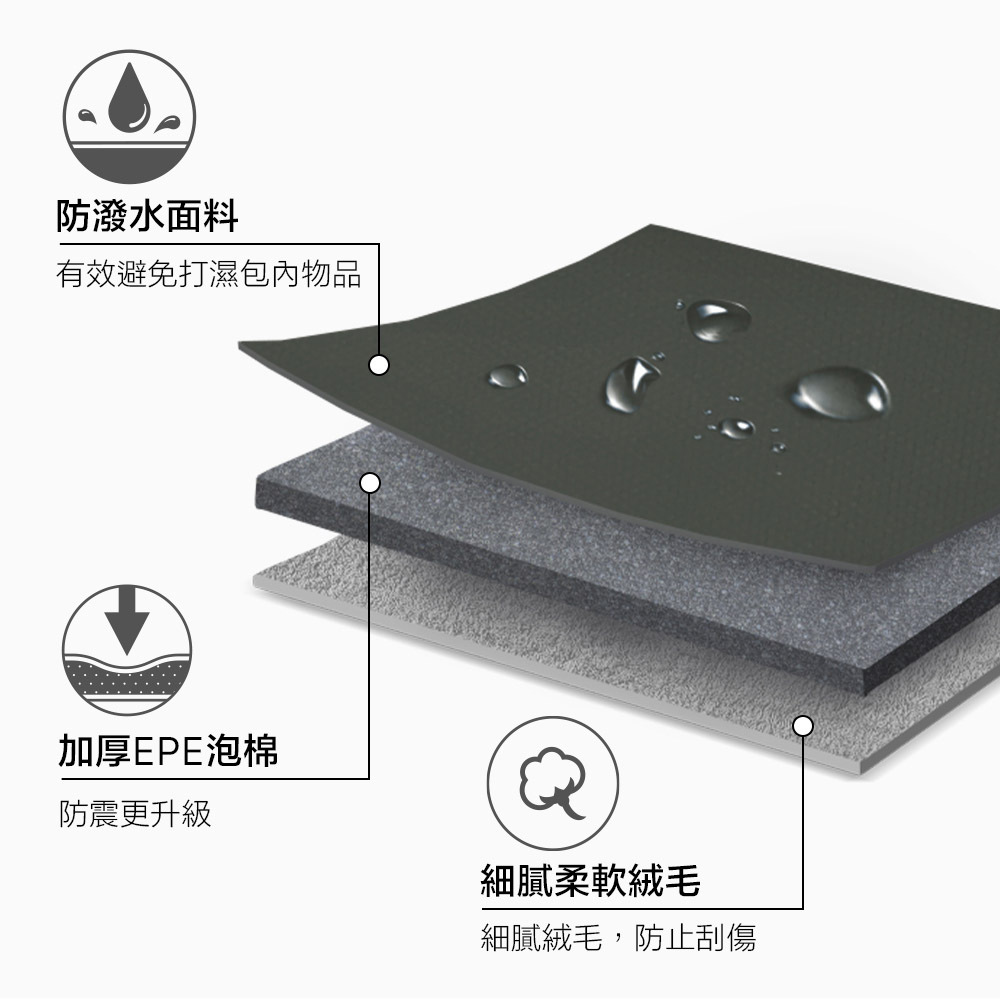材質:600D 皮膜/絨毛內裡/獨家防震泡棉/高彈力防滑帶