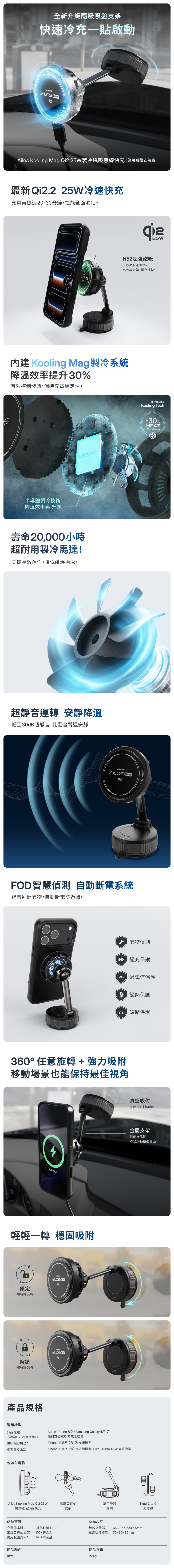 商品材質:鋼化玻璃+ABS(充電器本體)、PC+鋅合金(出風口夾式支架、萬用吸盤支架)