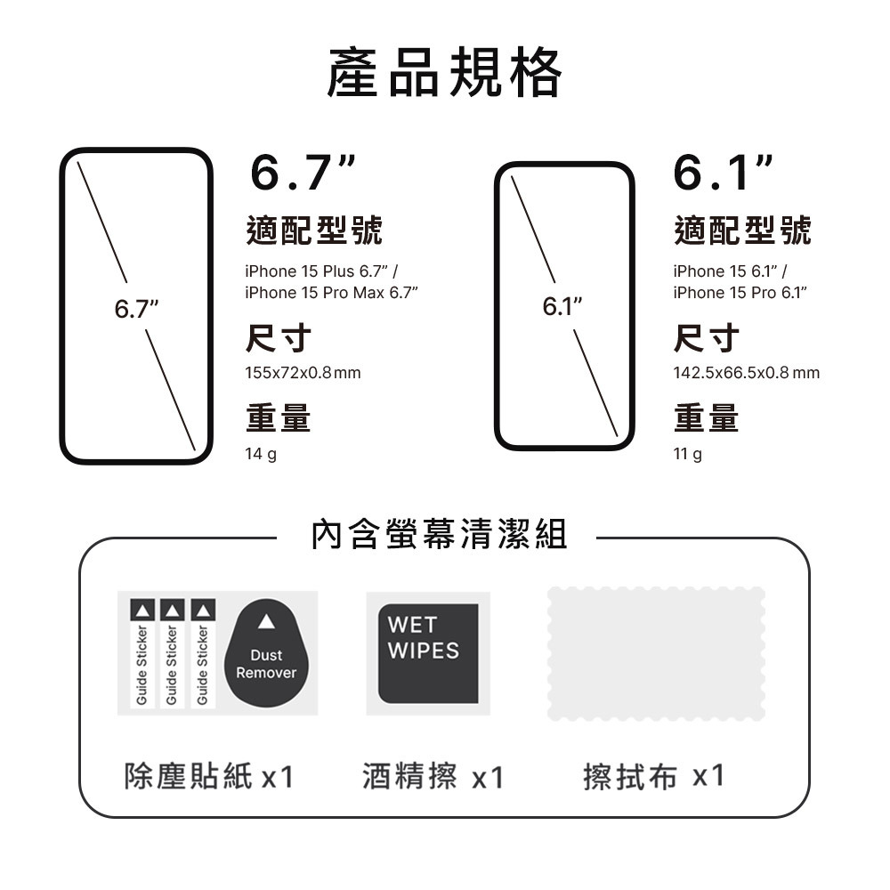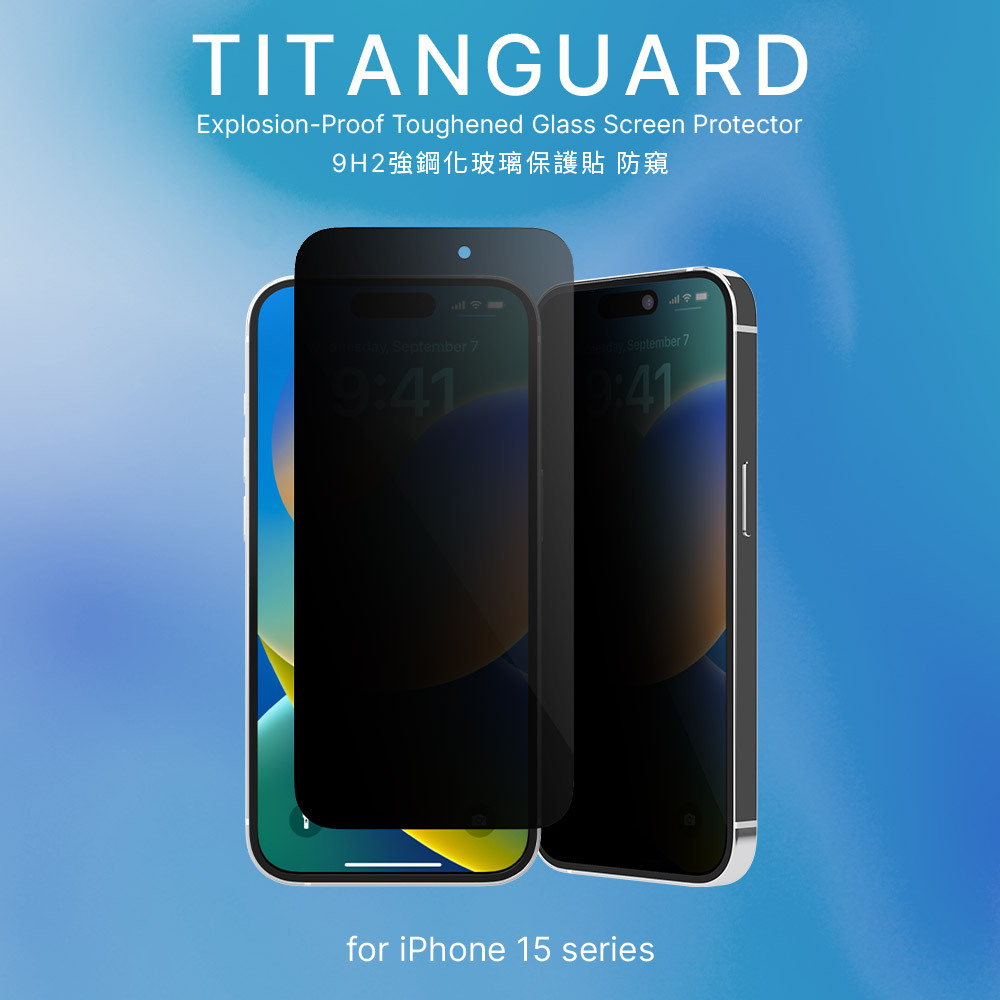 包裝內容物:JTLEGEND iPhone 15 / 15 Pro (6.1'') / 15 Plus / 15 Pro Max (6.7") TITANGUARD鋼化玻璃保護貼-防窺*1、清潔包*1