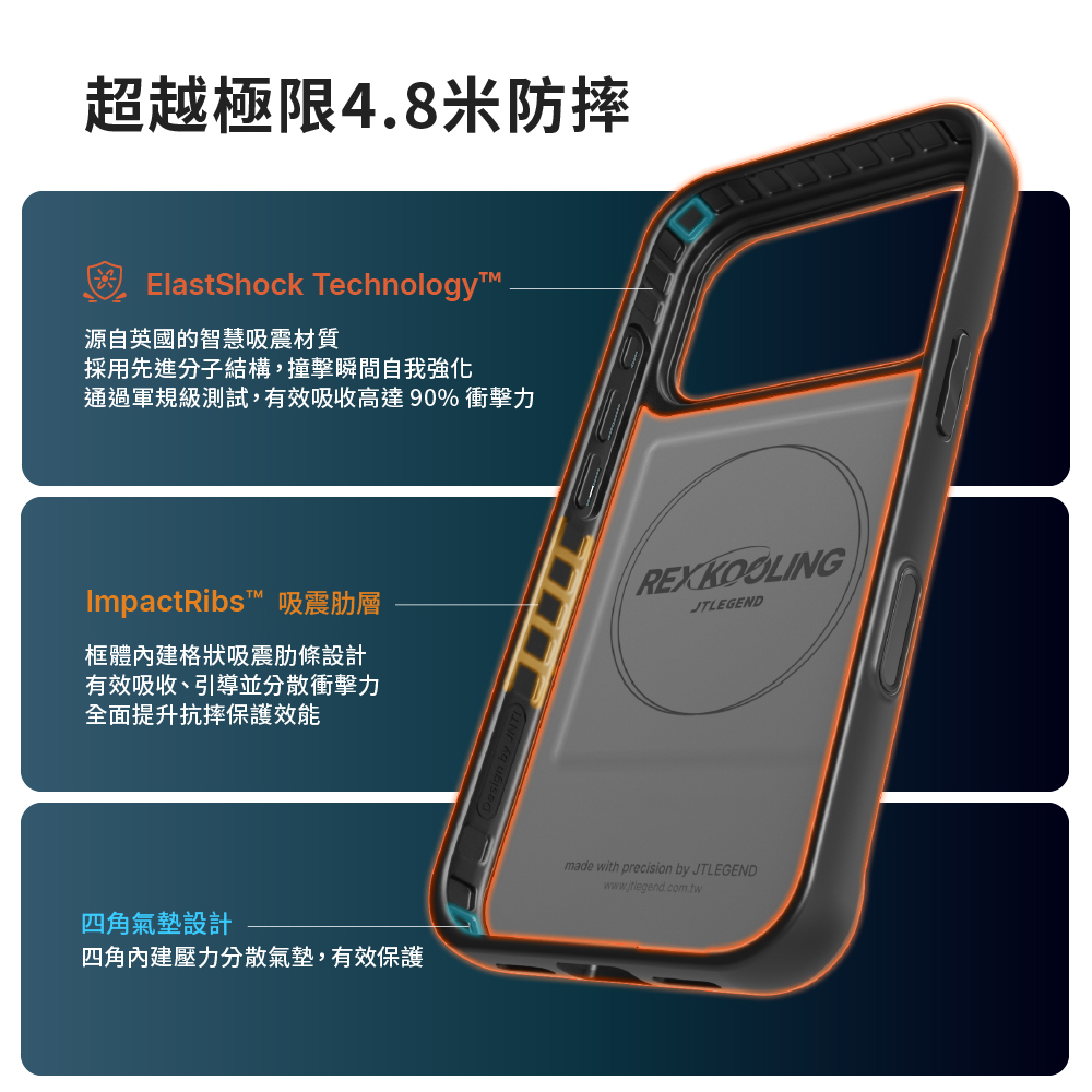 | ElastShock Technology™:專為防摔吸震而生的智慧材料,超越4.8公尺的防摔能力,兼顧輕盈與高防護。