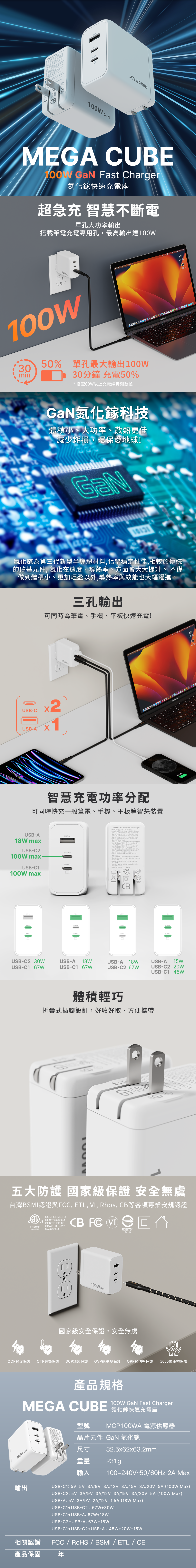 - 100W氮化鎵快充座 USB-A口*1、 USB-C口*2